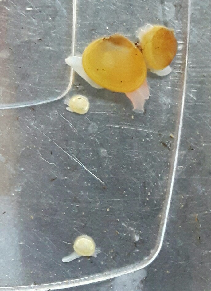 Durch den Frischwasserreiz ausgelöst, haben die Erbsen gleich mal ihre Lebendgebärendfähigkeiten unter Beweis gestellt... ganz schön groß, die Kleinen... und schon schnell unterwegs, fast "schneckenartig". Weil ich gerade das "Glück" habe, dass ein paar Winzaquarien von Trübung heimgesucht sind, habe ich mich getraut und jeweis eine Erbse eingesetzt. Sie schaffen es, sich auch in recht grobes Substrat flott einzugraben und machen ziemliche Strömung mit ihren leicht rosa angehauchten Siphonen... mal sehen, wie lange sie zur "Klärung" benötigen.
