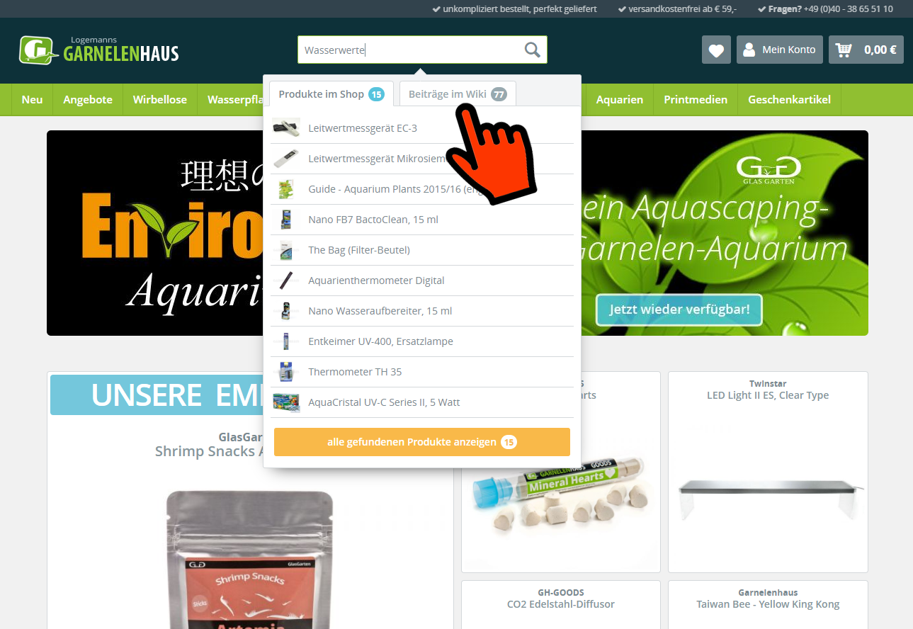 Klicke auf der Shopseite oben in das Suchfenster, gebe einen Suchbegriff ein und warte kurz, bis alle Ergebnisse gefunden wurden. Dann erscheint ein Fenster mit zwei Suchergebnisseiten, links für Produkte aus unserem Sortiment und rechts die Ergebnisse der Wiki-Suche.