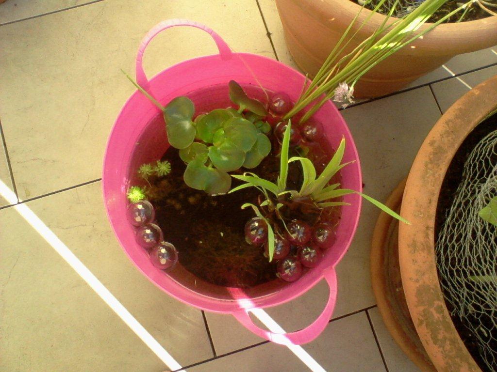 Das Schilf habe ich aus meiner wesentlich geschmackvolleren Zinkwanne geklaut, die Schwertlilie, die Eichhornia, das Myriophyllum aquaticum (Papageienfeder) und die Eleocharis acicularis (Nadelsimse) sind gekauft. Ableger der beiden letzteren könnte ich mir übrigens durchaus im Becken vorstellen ... ;).