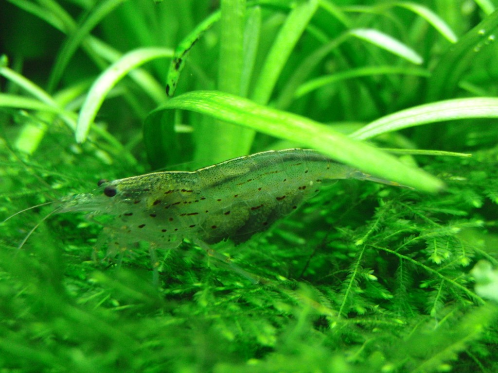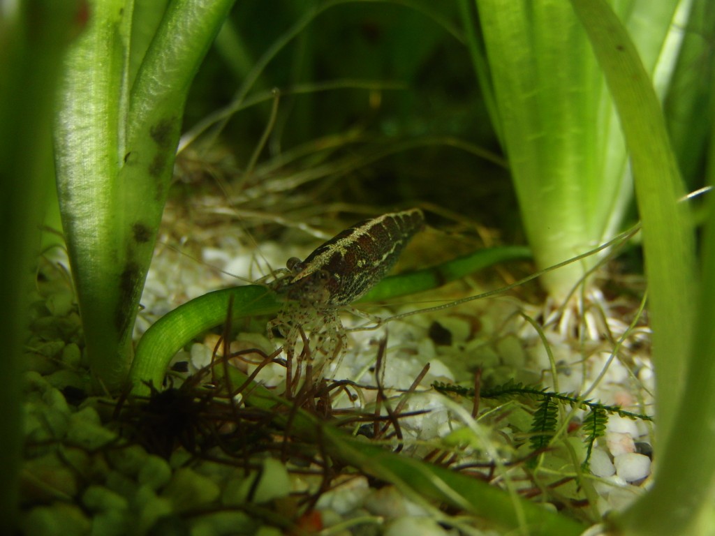 Ich kann noch sagen dass die Garnelen sehr aktiv sind, immer auf der Suche nach etwas fressbaren unterwegs und bei der Fischfütterung ganz wild werden und auch mal ne Futterflocke freischwimmend den Fischen vorm Maul wegschnappen. Derzeit tragen 2 große Weibchen jede Menge Eier, diese haben eine eher gräuliche Farbe. Weibchen sind eher dunkler als andere (Männchen!?) mit etwas bräunlicher Färbung und ausgeprägtem Rückenstrich.