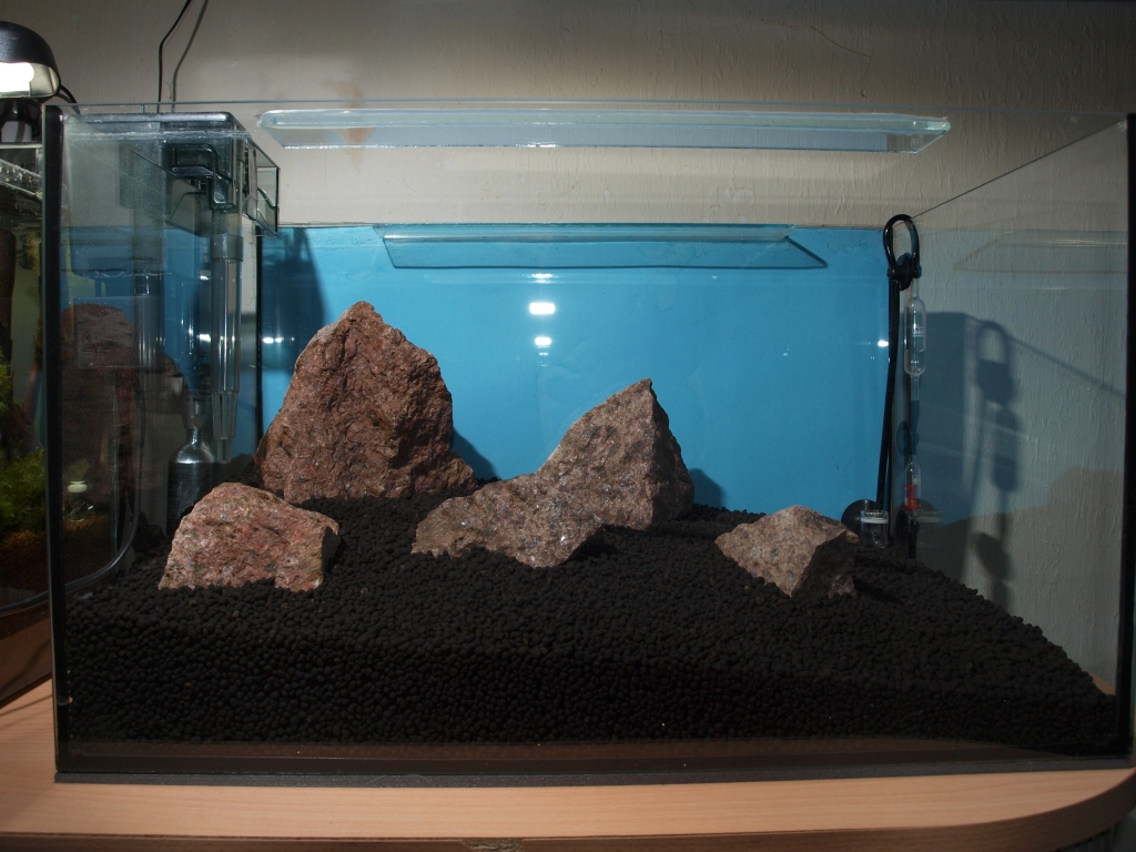 Zum Becken, es ist ein 45er, 50x30x30 cm. CO2 Zufuhr ist vorgesehen, Beleuchtet wird es mit zwei 15 Watt Röhren mit 9000 Kelvin werden, beide Röhren sind mit einem Reflektor versehen. Als Filter wird ein Anhängefilter seinen Dienst tun ( Aqua Clear Power Filter 20). Der Bodengrund ist Fluval Flora Stratum.