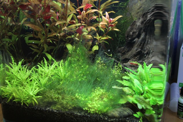 Bei dem zweiten Cube (läuft seit ca. 6 Monaten) hab ich anscheinend nicht solches Glück mit den Algen. Ich fürchte, ich hab mir mit dem Cuba Perlkraut, welches im Übirgen auch nicht besonders gut wächst, eine anständige Brutstätte für Fadenalgen eingefangen. Seit dem Wachstum der Fadenalgen haben sich am Papageienblatt so eine Art Bartalgen an den Blatträndern gebildet- ihh!