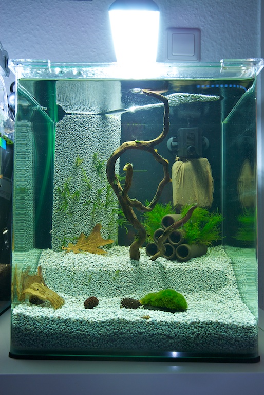 nachdem mein neuer 30er Cube nun schon eine Woche läuft, möchte ich ihn euch natürlich nicht vorenthalten! Die Einrichtung beruht auf Modulen aus Verbundkies, mit welchen man das Becken wunder einrichten kann. Ganz unten liegt ein Bodenfilter aus Verbundkies, welcher innen hohl ist. Das Steigrohr mit Luftanschluss ist hinter dem hohen Modul versteckt sowie ein kleiner Heizer von Aquael.