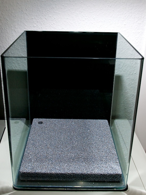 die Bodenfilter sehen von allen Seiten gleich aus. Nur oben ist eben noch ein kleines Loch für das Steigrohr. Ich habe den Bodenfilter direkt auf die Glasscheibe gelegt, aber ich glaube es spricht nichts dagegen noch etwas unter den Filter zu legen.