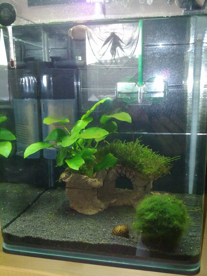 Nur Anubias, Moos(algen)ball und etwas Moos ist aber in meinen Augen zu wenig, um Algen vorzubeugen und ein gesundes Beckenklima zu bekommen.