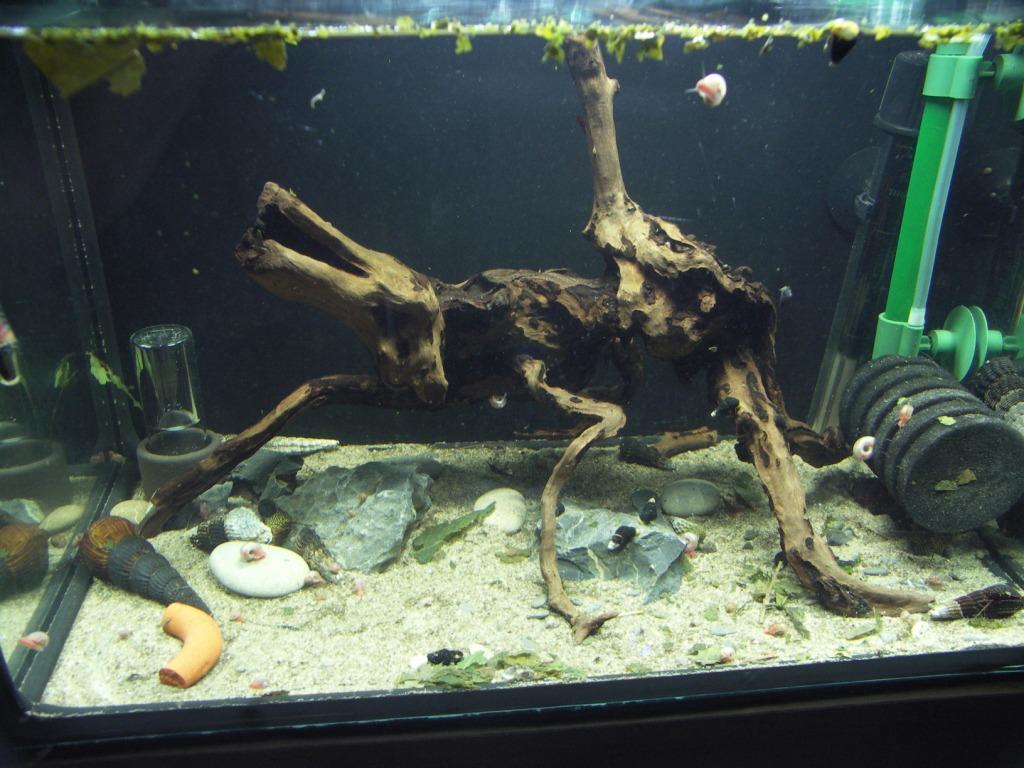 Bodengrund: gereinigter Lech-Fluss-Sand (0,5cm hoch), Wurzel, kalkhaltige Mini-Landschaft-Steine, Schwammfilter, Mini-Oxydator, Temperatur: 28°C, Wasser: aktivkohlegefiltertes Regenwasser mit Testsalz. Gesellschaft: Tylos, rosa Posthörnchen.