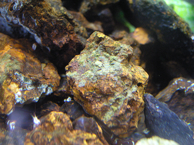 Der Stein war am ersten Tag fast komplett grün, das eine Bild zeigt ihn 12h nach Besatz und das andere Bild zeigt ihn weitere 48h später.Schnecken sind nicht im Becken.