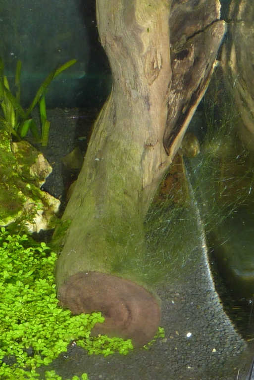 - Abschrubben des Steines und der Wurzel (habe ein bisschen Angst, den Stein rauszunehmen, da dfie CR-Babys in den Löchern „wohnen“. Bleiben die im AQ, wenn das Wasser zurückgeht?)