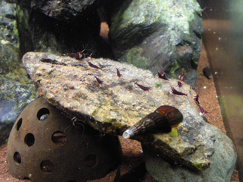 Ein Stein kam auch ins Kardinalbecken, hier sind sie (noch) nicht so rangegangen wie gestern an den AgarAgar-Futterstein.