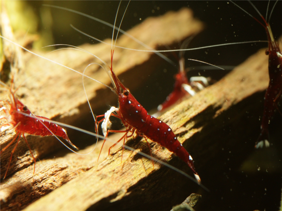 Die Färbung der Kardinalsgarnele ist Tages- und Stimmungs-abhängig. Bei uns zeigen sich die Tiere früh morgens rot und abends auch, tagsüber sind sie fast alle dunkel lila, einige werden zwischendurch zeitweise rot. Die Punkte erscheinen blau wenn sich die Tiere lila zeigen, wenn sie sich rot zeigen sind die Punkte weiß.