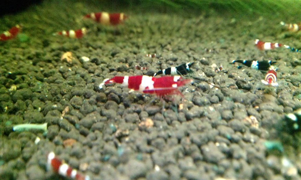 Gelegentlich füttere ich auch andere Futtersorten wie das Crustahunter- Garnelenfutter und SHIRAKURA Ebi Dama oder Frostfutter (Mückenlarven, Artemia usw.). Bei den Plättchen von Shirakura und Crustahunter gefällt mir, aber nicht, dass die Futter so lange im Becken liegen und dass die kleineren Garnelen kaum eine Chance haben etwas abzubekommen. Sie eignen sich aber sehr gut um die Garnelen nach vorne zu locken um sie zu zeigen.