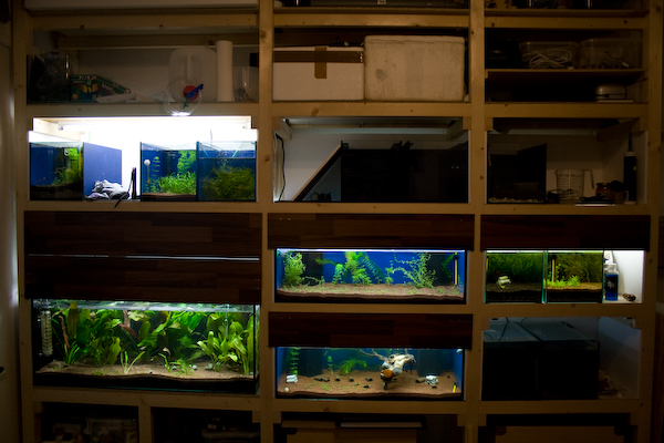 nachdem ich mittlerweile gründlich infiziert bin und mir die Platzfindung und überall-rumstehen Becken irgendwie zu nervig werden, plane ich nun ein Regal für 9 oder 12 kleine Würfel. Die künftigen Bewohner sollen ausschließlich Garnelen, Schnecken, Zwergkrebse sein. Jede Art bekommt ein eigenes Becken.