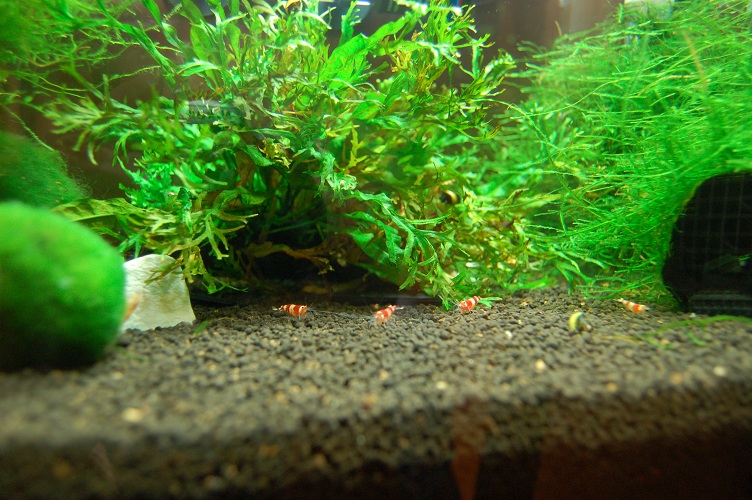 Hier ein Foto von meinem Garnelenbecken inklusive der Bewohner. Habe Heute zum ersten Mal Ebi Dama von Shirakura gefüttert. Ich war echt Erstaunt... Innerhalb von 2 Minuten tümmelten sich alle Garnelen im vorderen Bereich und "rauften" um das Futter. Die kamen ja förmlich angelaufen... Mit den JBL Kugeln bei meinem ersten Garnelen Versuch war das nie so extrem. Ich bin echt begeistert. :)
