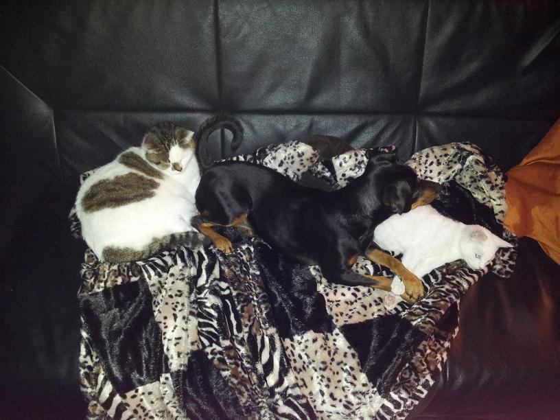 Das da auf dem Bild ist ja noch harmlos. Es kommt auch schon vor, dass 3-5 Katzen plus der Hund auf mir drauf liegen.