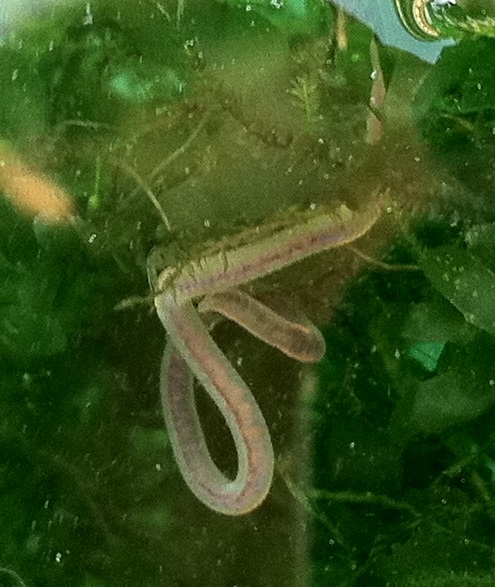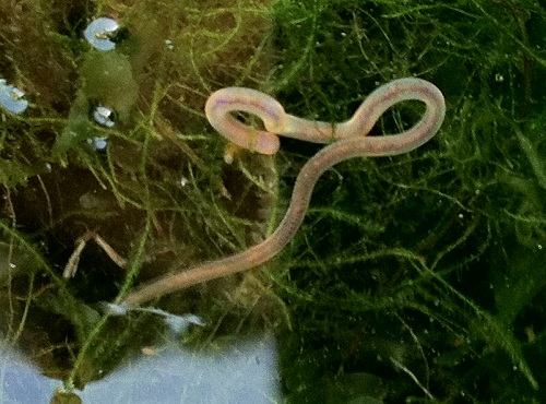 Haber gerade die Schale mit Wasser und Moos (das ich ja auf Lava aufbinden will) in die sonne nach draußen gestellt ... Der wurm hat eine irisirende Haut, und schimmert in Regenbogenfarben.