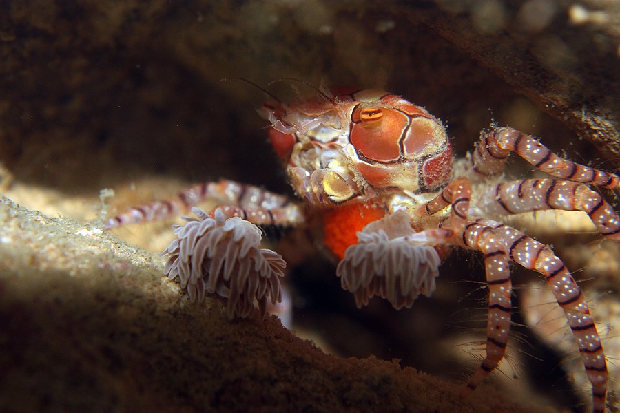 Krabben, Krebsen und Garnelen tragen ihre Eier an den Pleopoden - oft auch als Schwimmbeine bezeichnet. Diese befinden sich auf der Unterseite der hinteren Hälfte der Tiere.