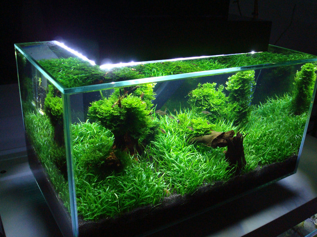 Bei der Bepflanzung habe ich mich für Neuseelandgras - Lilaeopsis brasiliens sowie Korallenmoos -Riccardia chamedryfolia, das auf Garnelenbäumchen gebunden wurde, entschieden.