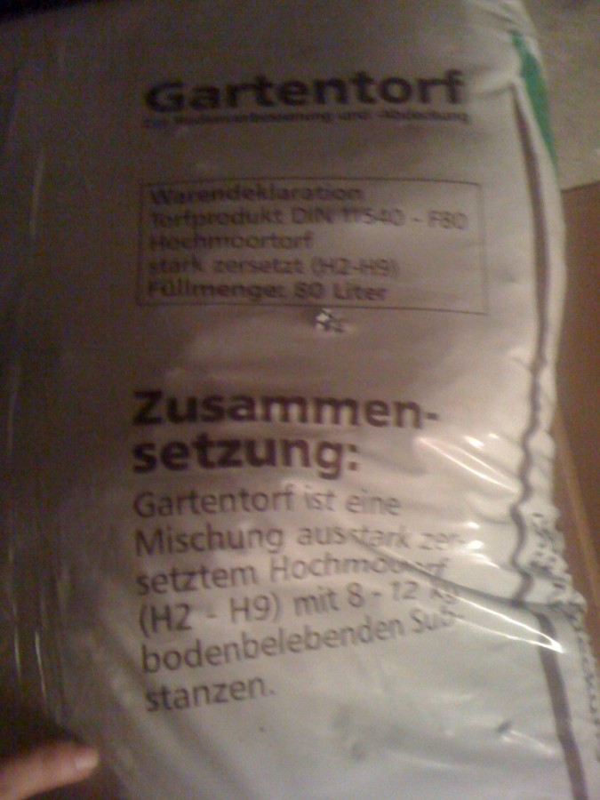 Somit ab zum Hornb***, Kunststoffrohr und nen passenden Deckel gekauft. Ungedüngten Torf hatten die angeblich nicht also ab zum Blumenladen, beraten lassen, Torf gekauft. Zuhause ist mir dann die Aufschrift aufgefallen.