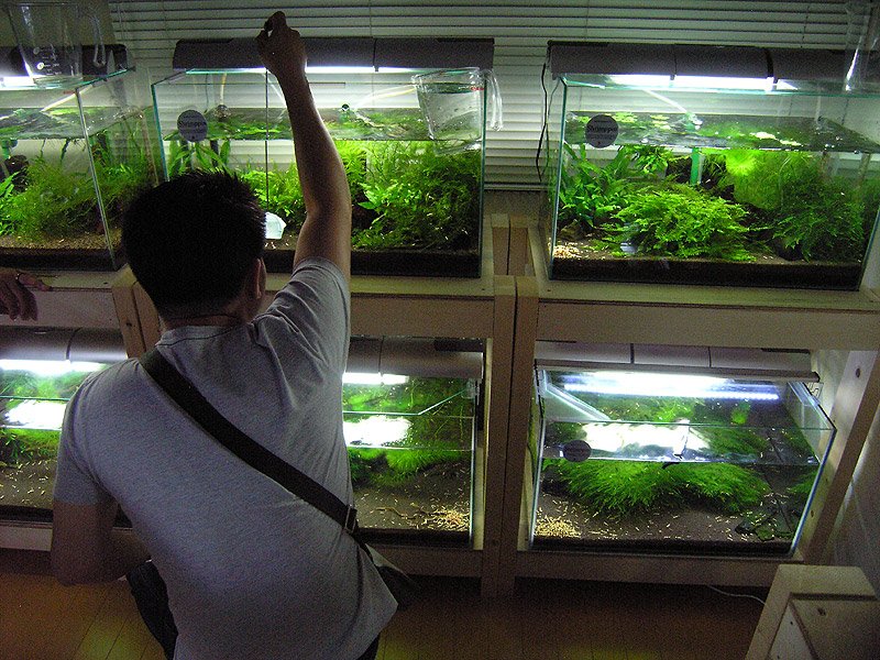 Der Boden war ausgelegt mit Handtüchern und alles in allem machte es eher einen traurigen Eindruck. Und dahinter steckt auch eine traurige Geschichte, denn das Erdbeben im März hat bei Ueno richtig zugeschlagen. Es hat seine Wohnung so sehr geschüttelt, dass 90% der Wassermenge mit dem Großteil der Garnelen heraus schwappte und die Wohnung unter Wasser setzte. Auch die schönen ADA Hängelampen vielen von der Decke und in die Becken rein. Herr Ueno war nicht zu hause und man kann sich sicher vorstellen, was das für ein Erlebnis gewesen sein musste, als er nach hause kam. Zunächst hatte er wohl aber andere Sorgen als sich um die Garnelen zu kümmern, denn sein Wasser ist bis zu den Nachbarn zwei Stockwerke tiefer gelaufen und hat auch dort noch Schäden verursacht....... man kann sich vorstellen, dass so ein Erlebnis sehr depremiert und bis heute hat er offenbar noch nicht wieder zu der alten Freude an der Aquaristik und Garnelenzucht zurückgefunden......