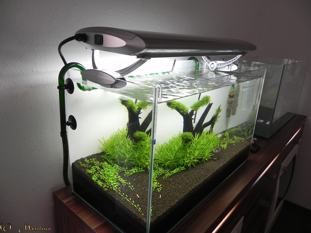 Ich habe ziemlich lange überlegt wie ich es gestalten werde. Am Anfang fiel mir sofort ->Iwagumi<- ein. Hab mich dennoch dagegen entschieden. Da ich Glossostigma elatinoides (Bodendeckende Pflanze) ziemlich schön finde, werde ich das Aquarium damit einrichten. Als zweite Pflanze wird es Moos an einem großen Hayashi Bäumchen sein, denke da an Mini Pellia. Bin mir aber noch nicht sicher.