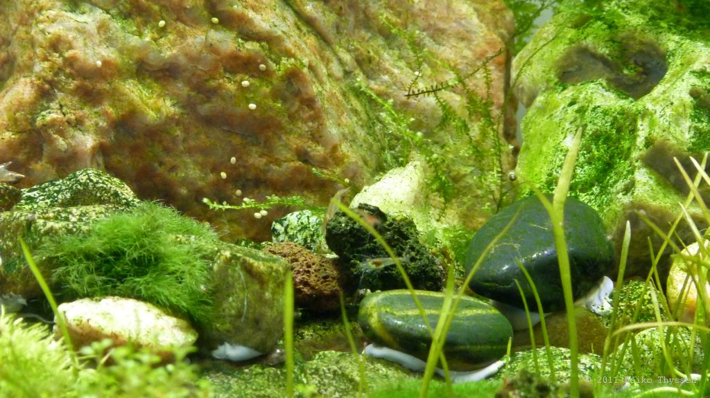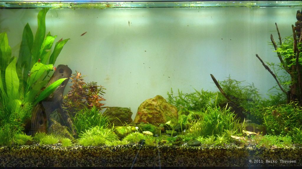 Nachdem das "neue" nun mehr als eine Woche mit vorhandenem Aquarienwasser eingelaufen ist, sind die Pflanzen und die ersten (wenigen) Bewohner eingezogen. Unser Forenmitglied NebelGeist war ja neugierig zu sehen, wie das ganze mit Pflanzen aussieht. Gut - die müssen natürlich noch wachsen, aber hier mal 3 Bilder...