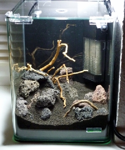Bepflanzung: Das dominante Moorkienholzstück wird teilweise mit Riccia bebunden, der mittlere und hintere Teil bis zum Filter sowie einige kleine Stellen zwischen den Steinen soll mit HCC bepflanzt werden. Im Hintergrund soll Eleocharis acicularis stehen und links in dem "Loch" soll ein kleiner Bolbitis heteroclita (Edanyoa difformis) sitzen. Rechts kommt etwas Lilaeopsis brasiliensis hin. Ganz vorne links sollen ein paar kleine Stecklinge Rotala mexicana Goiás stehen. Feddich.