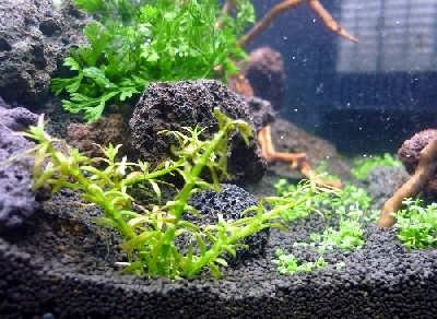 Bepflanzung: Das dominante Moorkienholzstück wird teilweise mit Riccia bebunden, der mittlere und hintere Teil bis zum Filter sowie einige kleine Stellen zwischen den Steinen soll mit HCC bepflanzt werden. Im Hintergrund soll Eleocharis acicularis stehen und links in dem "Loch" soll ein kleiner Bolbitis heteroclita (Edanyoa difformis) sitzen. Rechts kommt etwas Lilaeopsis brasiliensis hin. Ganz vorne links sollen ein paar kleine Stecklinge Rotala mexicana Goiás stehen. Feddich.