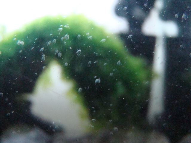 ....diese Knubbel an der Scheibe sehen mir nicht nach Algen aus sondern eher nach irgendwelchem Viehzeux