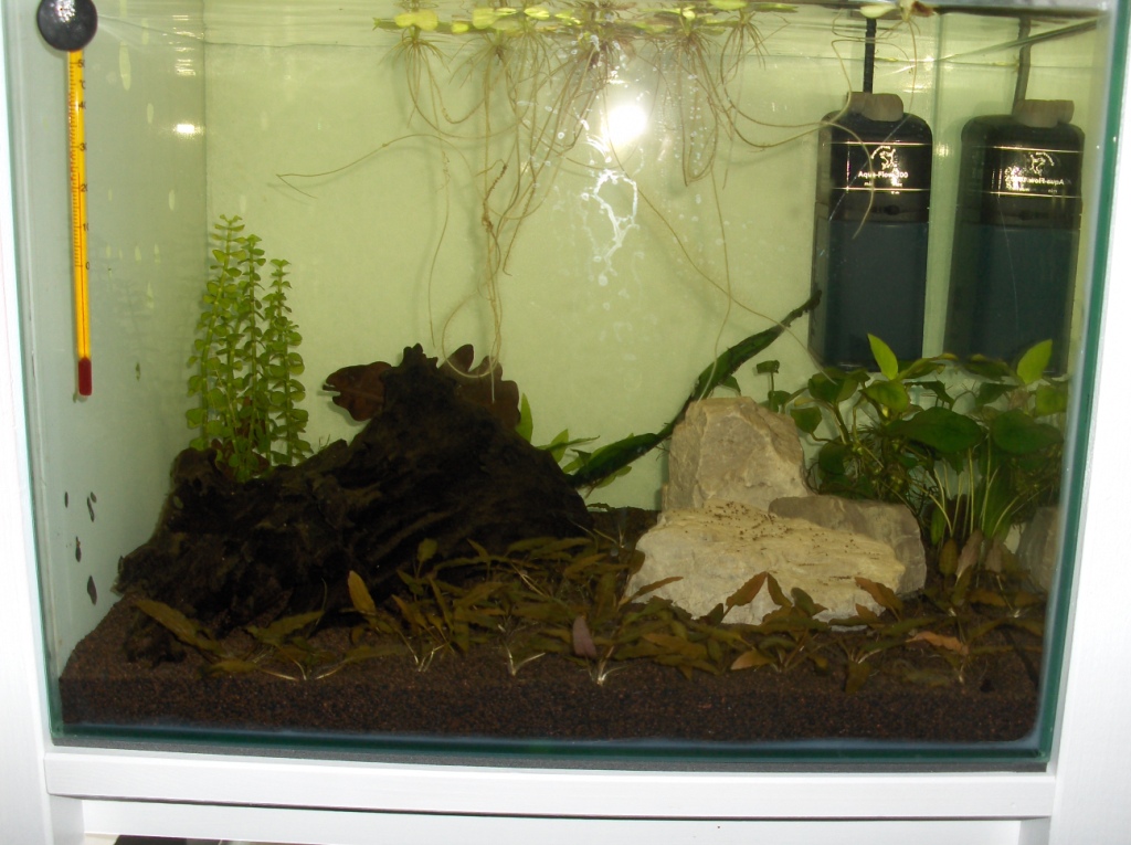 Das Regal ist ein Ivar von Ikea (verstärkt und mit der Wand verschraubt) und die Lampen sind 8 W Unterbauleuchten,gefiltert wird mit Innenfiltern Aqua Flow 100.