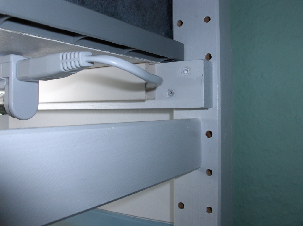 An Regal habe ich hinten 2 Platten angeschraubt etwa in der Höhe der Aquarien,an dehnen sind dann auch die Steckdosen für Beleuchtung und Filter angeschraubt.