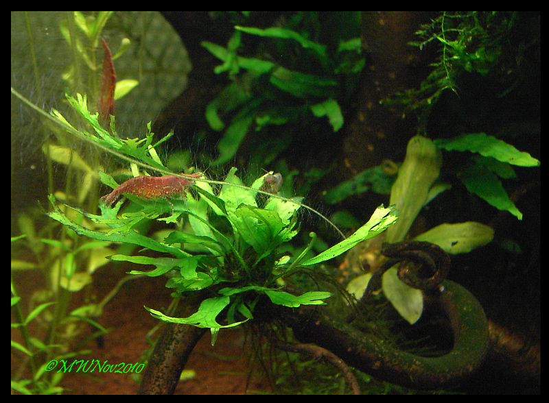 Irgendwie hab ichs ja neben den nicht so einfach zu pflegenden Garnelenarten auch mit eher seltenen und schwerer zu kultivierenden Pflanzen und so bin ich, nachdem an seltenen Cryptocorynen nichts mehr zu bekommen war in letzter Zeit, auf die ausschließlich auf Borneo vorkommenden Bucephalandra Varianten gestoßen. Für mich im Moment ein absolutes Highlight, deshalb einige Eindrücke von zwei Varianten. Die anderen 4 sind noch nicht wirklich sehenswert, da sie entweder semisubmers wachsen oder sich gerade in der Umstellung befinden...ohne Blätter is dann doch nicht so schön :D