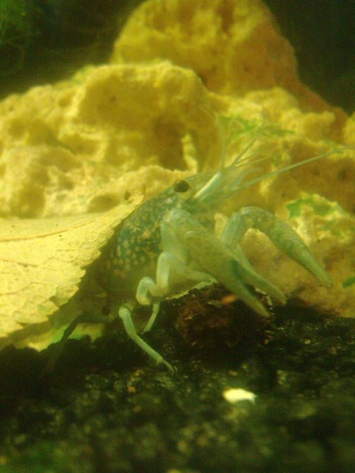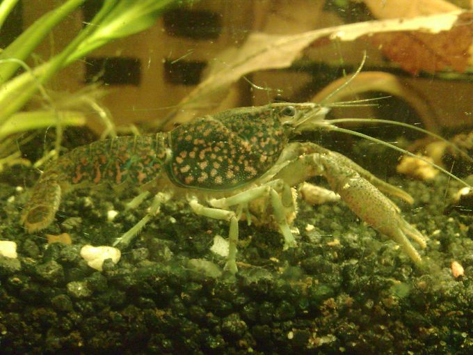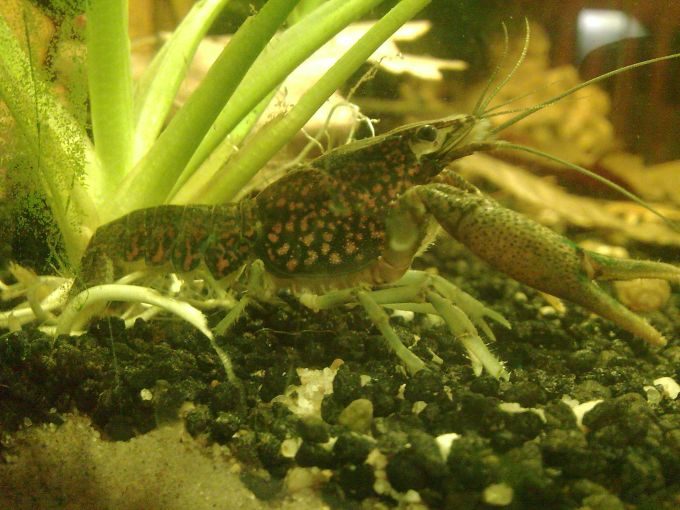 Ein Zwergflußkrebs aus den südlichen USA, Größe etwa bis 8 cm. Mitunter etwas ruppig untereinander (Männchen), und auch an die Harnischwelse mussten sie sich erst gewöhnen - erst hatten sie gewaltig Schiss, dann wollten sie sie schnappen, nun ist aber wieder Frieden. Gefüttert wird Frostfutter und Krebs-Tablets, Heu-Paprika-Sticks sowie allerlei Laub, Eichenrinde und Erlenzapfen, die sie bis auf den Stumpf abkauen.