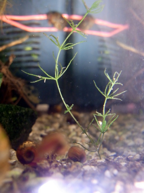 Sieht ja ein bißchen aus wie Hornkraut, aber warum wächst das denn aus dem Boden? Oder ist es ein Wasserpest Sämling? Wasserpestblüten hatte ich genug in diesem Aquarium.