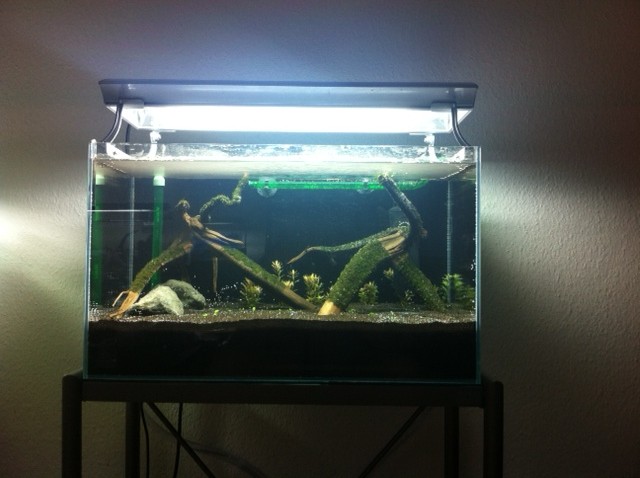 Filterung findet mittels Eheim Bodenfilter und daran gekoppelten Eheim Ecco Pro 200 Außenfilter mit Sera Siporax Mini und Eheim Substrat Pro