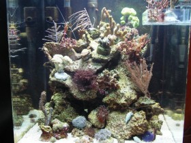 Mein Marinus ist bestückt mit wiederbelebtem Riffgestein, was ein Freund für mich gereinigt, gewässert und wieder in seinen Becken zum Leben erweckt hat. Ich habe mich für wiederbelebtes Gestein entschieden, weil ich Plagegeistern wie Glasrosen und sonstigem für Anfänger schwer bekämpfbaren aus dem Weg gehen wollte. Leider haben die Steine Phosphat Depot´s, was mir einen PO4 Wert von 1,0 bescheert hat und den ich noch immer bekämpfe, ist aber schon auf 0,3 gesunken.