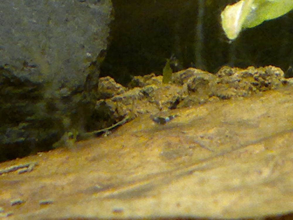 Hallo! Kurzes Statement: Die kleinen sind schon ordentlich gewachsen und sind jetzt ca. 2,5mm groß. Ich entdecke immer mehr Garnelen und diese trauen sich endlich aus ihren Verstecken. Leider konnte ich die Tage keine Taiwaner finden und dachte, sie wären nicht durchgekommen... Aber wie schön, vorhin noch diese zwei Exemplare entdeckt zu haben. Ich tippe mal auf 2 Pandas? ;)