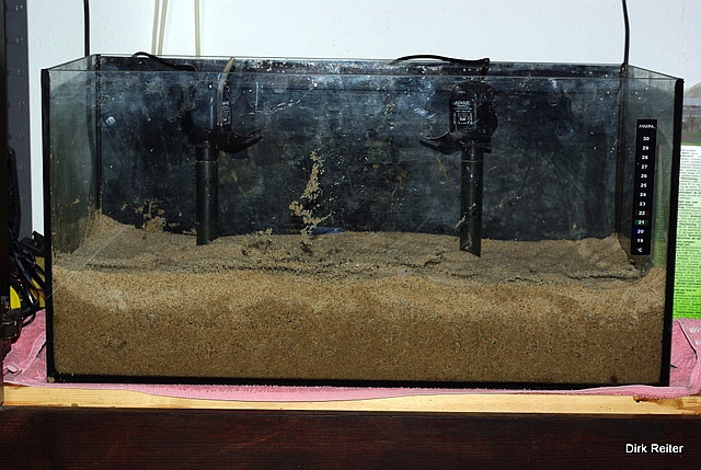 Becken 3: Mit Fuji-Sand, einem Lavagranlat (1-5mm Körnung). Das Zeugs ist extrem dreckig und muss mühsam ausgewaschen werden. Im Becken sieht es aber einem Soli zum verwechseln ähnlich. Die Tiere sind jetzt aber erst ca. 1 Woche im Becken, fühlen sich aber sichtbar wohl. Bin gespant wie sich ein zukünftiger Nachwuchs entwickelt. Erstaunlich finde ich die Anzahl der Kleinstlebewesen im Bodengrund. Wo man hinschaut zuckt und krabbelt es :)