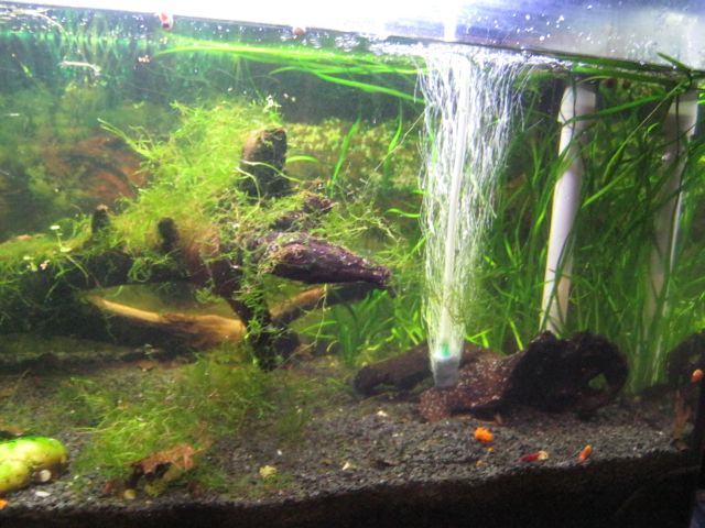 Mittig im Aquarium habe ich eine Wurzel,die mit Weepingmoos bestückt ist,dann einen Schieferkletterturm,der ganz oben mit Fissidens Fontanus bestückt ist,genauso die 3 kleinen Minihöhlen recht´s neben den Turm.
