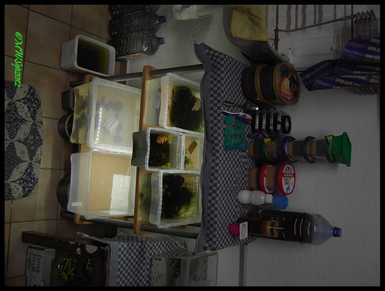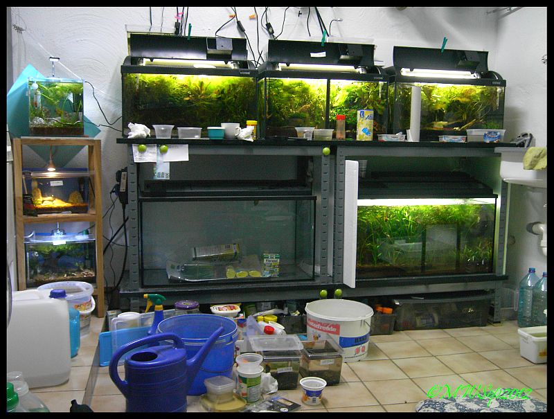 Die ganzen Boxen und Schälchen- das kann ich gar nicht. Bin ja die ganze Woche über weg von daheim, deswegen kann ich das nicht machen, diese vielen Wasserwechsel bekäme ich ja gar nicht hin.