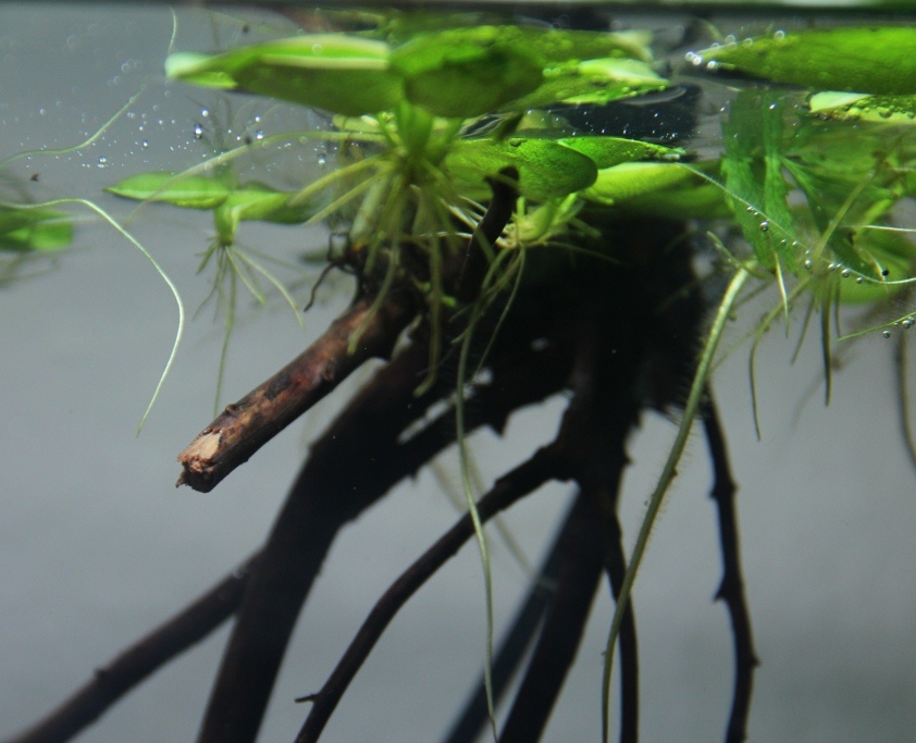 Habe in meinem "20"l-cube seit etwa 1 1/2 Wochen 20 Boraras brigittae. Vom Platz her passen die locker da rein, vom Verhalten her wären 10 - 15 vielleicht besser gewesen... Brauchen auf jeden Fall (in so einem kleinen Becken?) lange, bis sie schnallen, daß es hinter der Scheibe nicht weitergeht. Ein paar Schwimmpflanzen sind wahrscheinlich hilfreich; will ich, wenn ich welche bekomme, ausprobieren. Ich dachte an Froschbiß, der bei dir auch rumschwimmt (Limnobium laevigatum), oder Schwimmende Wolfsmilch (Phyllanthus fluitans). Beim Froschbiß muß man mit den sehr langen und sich dann auch im Bodengrund verankernden Wurzeln leben. Sprich öfter Wurzeln kappen - und die wachsen schnell!!! (Wenn du die aus einem anderen Becken hast, kennst du das...)