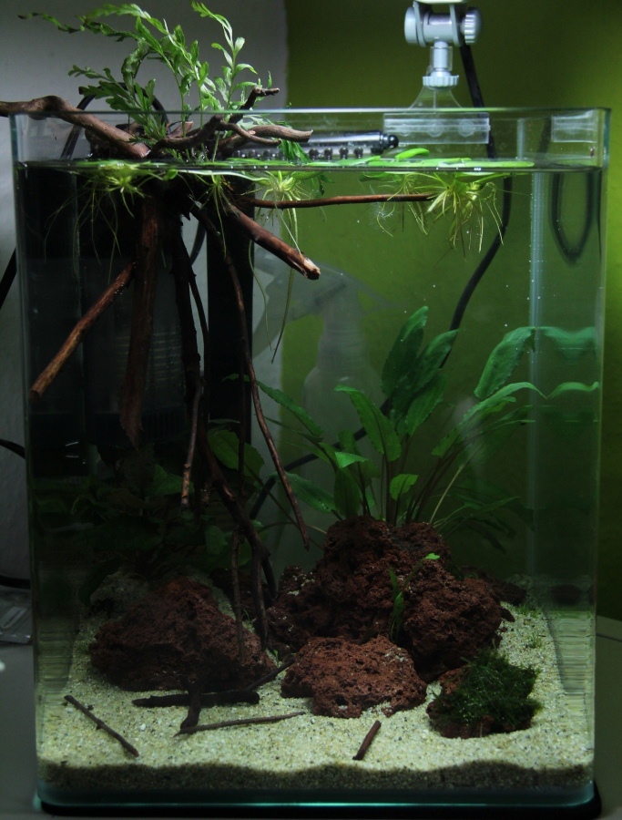 Beleuchtung: 1x 9 Watt dennerle plus 1x 11 Watt Aquatic Nature. Pflanzen: Hemianthus calitrichoides 'cuba', Pogostemon helferi, ein mir unbekanntes Moos, Hedyotis salzmannii, Rotala sp. 'Enie' (ich hasse diesen Namen, aber die Pflanze ist doll) sowie Rotala rotundifolia, die allerdings höchstwahrscheinlich wieder rausfliegt.