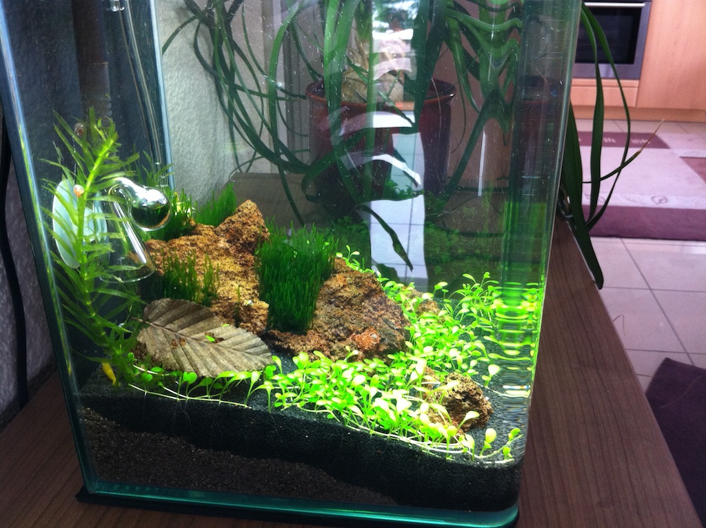 Dies hier ist ein Dennerle Nano Cube 10 Liter mit einem Wave Nano Rucksackfilter und einem Dennerle Nano Topper
