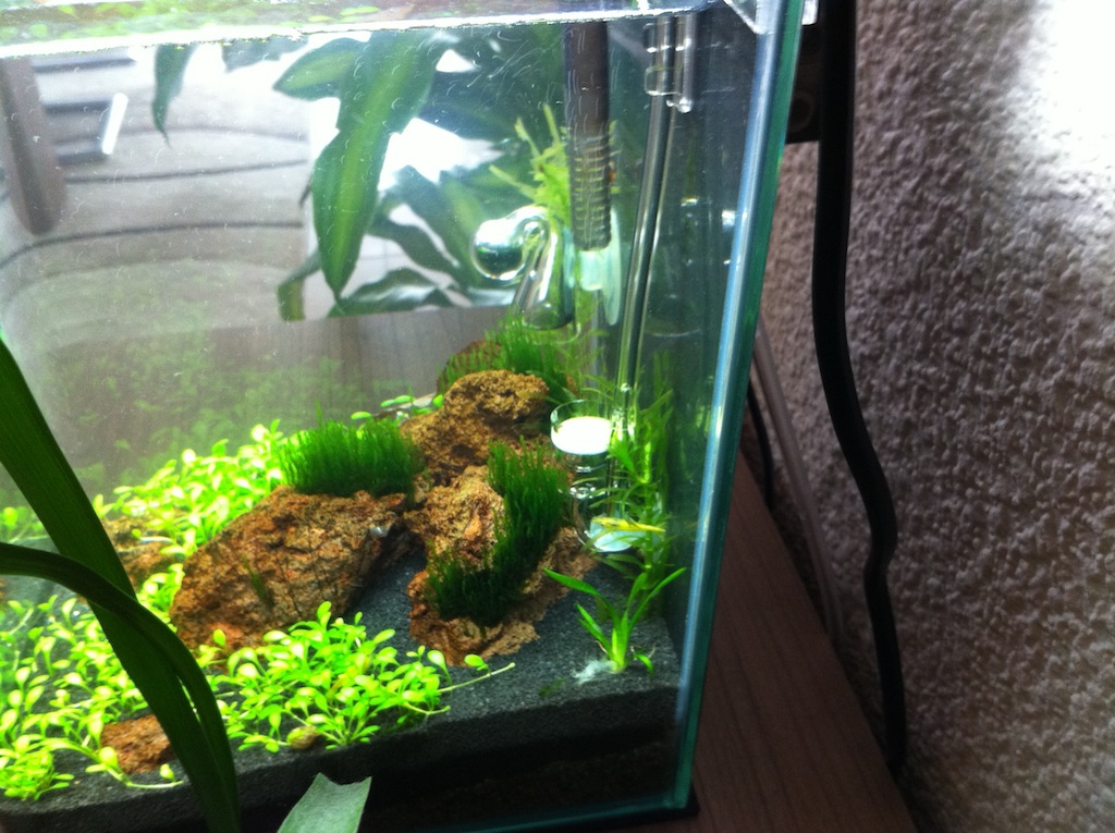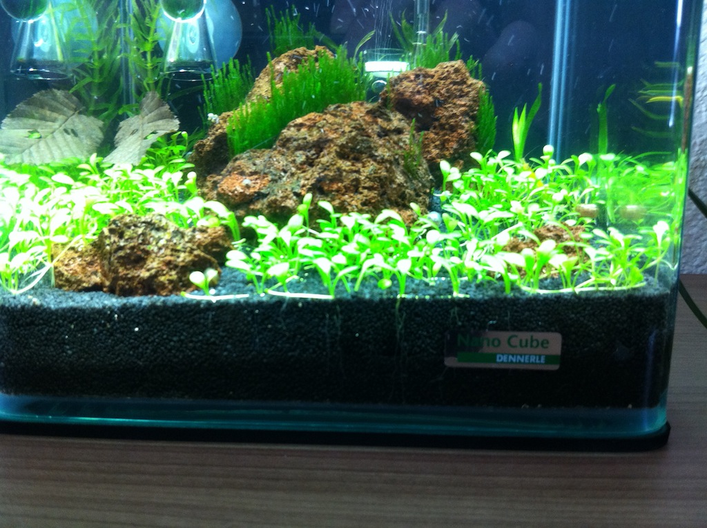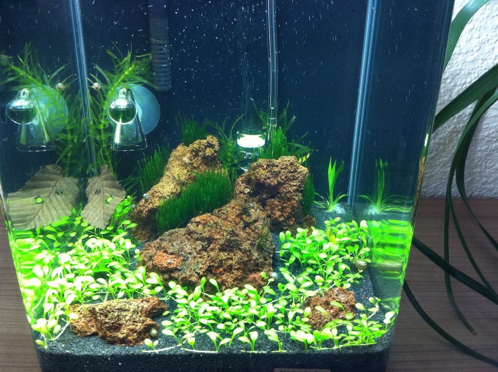 Dies hier ist ein Dennerle Nano Cube 10 Liter mit einem Wave Nano Rucksackfilter und einem Dennerle Nano Topper
