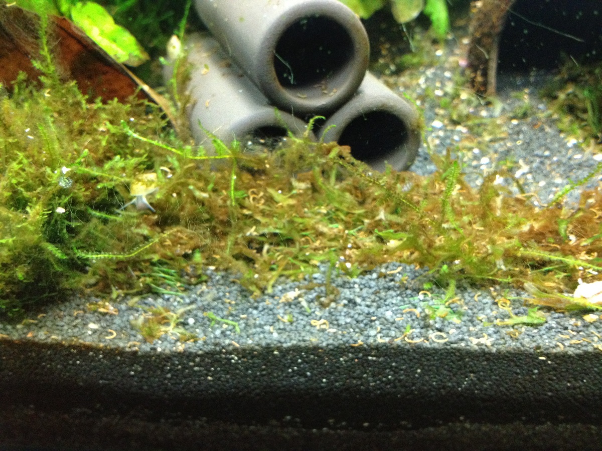 Ich lade noch ein verschwommenes Bild hoch, dort sind relativ viele braune Algen zu sehen (laut Zoo&Co kein Problem), ansonsten hatte ich keine Auffälligkeit. Das Gras in der Front des Aquariums hatte schon bessere Zeiten, aber nachdem wir dieses vom Metallgitter entfernt hatten (dachte es gibt vielleicht Giftstoffe ans Wasser ab), löst es sich so langsam auf.