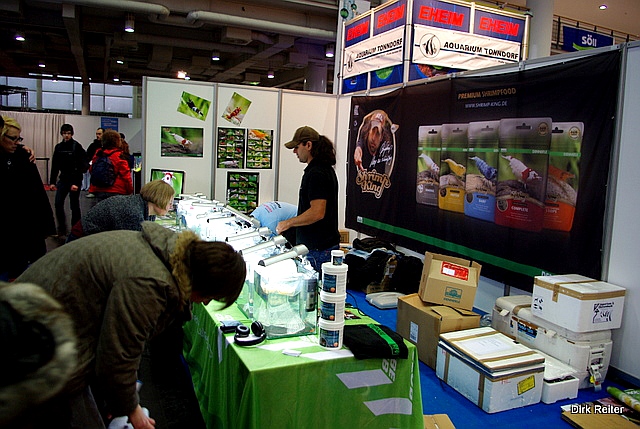 Gegenüber liegend war der Stand von Chris Lukhaup. Dort wurde das Shrimp-King Futter von Dennerle präsentiert und das Bee-Salz. Aber auch Krebse und Garnelen konnte man in den Becken bewundern und kaufen.