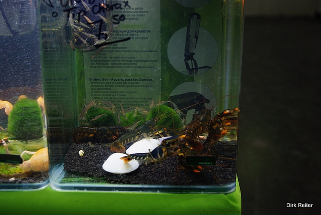 Es herrschte kein "Nebel des Grauens" , den Garnelen wurde endlich ein Stück Moos (auf Schieferplatte) angeboten und die Becken wurden mit Filter betrieben. Dies kam den Garnelen sichtlich zu Gute, sie wirkten deutlich agiler als in den ersten zwei Jahren. Dafür ein großes Kompliment an den Veranstalter, den Sponsoren und den Helfern. Ihr habt tolle Arbeit geleistet, zum Wohle der Tiere...