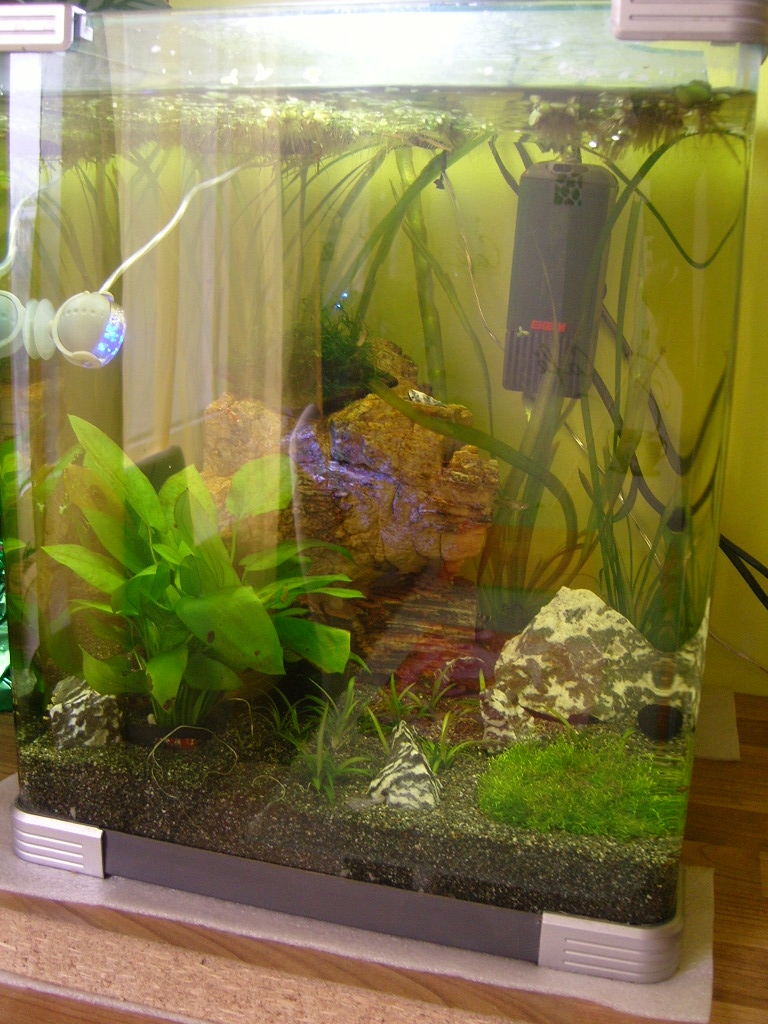 Bodengrund Garnelen Sand ca 1mm Körnung.Div Moose sind drin bei den Taiwanern ein großer Pagoden stein.bei den Mosura Aqua Soil bodengrund 6cm hoch. Div Moose und Außenfilter innen Schwamm. Mit Aqua Scaping gestein und einer Moorkienwurzel.