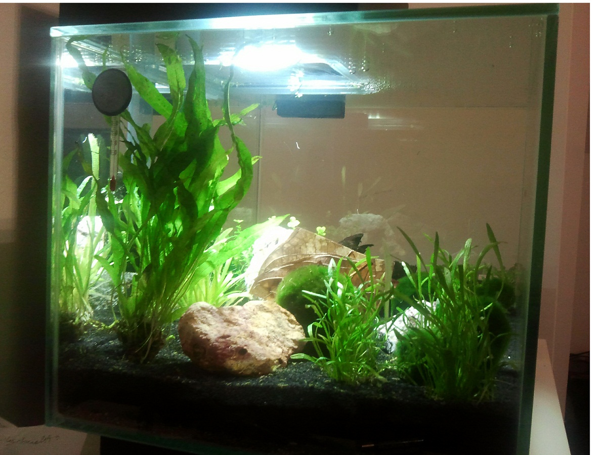 Das Becken läuft seit Anfang Januar, da ich Filtermaterial und jede Menge Mulm aus dem 120l-Becken meiner Schwägerin übernehmen konnte, durften bereits nach einer Woche Schnecken und Yellow Fires einziehen. Eine Woche später kamen dann die Zwergbärblinge hinzu. Allen Bewohnern gehts prächtig, Fische und Nelen harmonieren super untereinander.