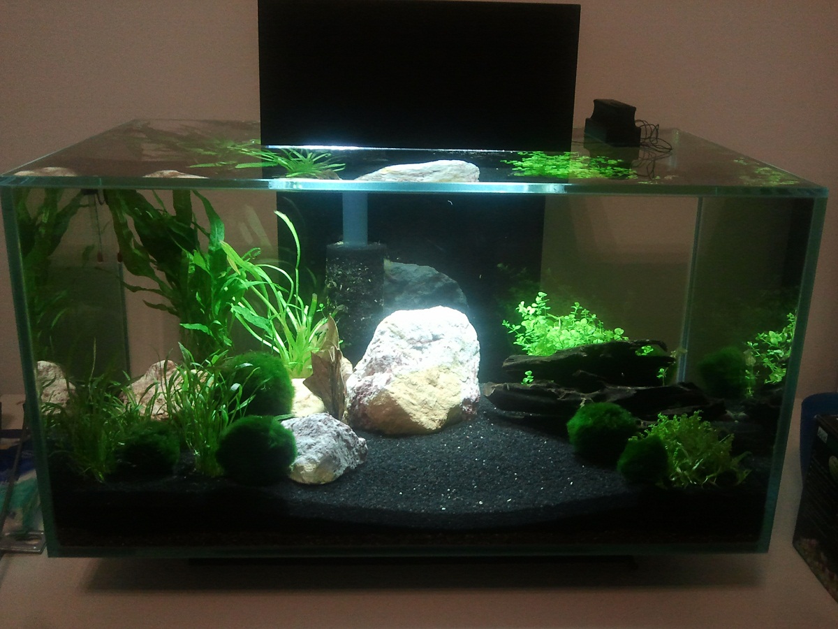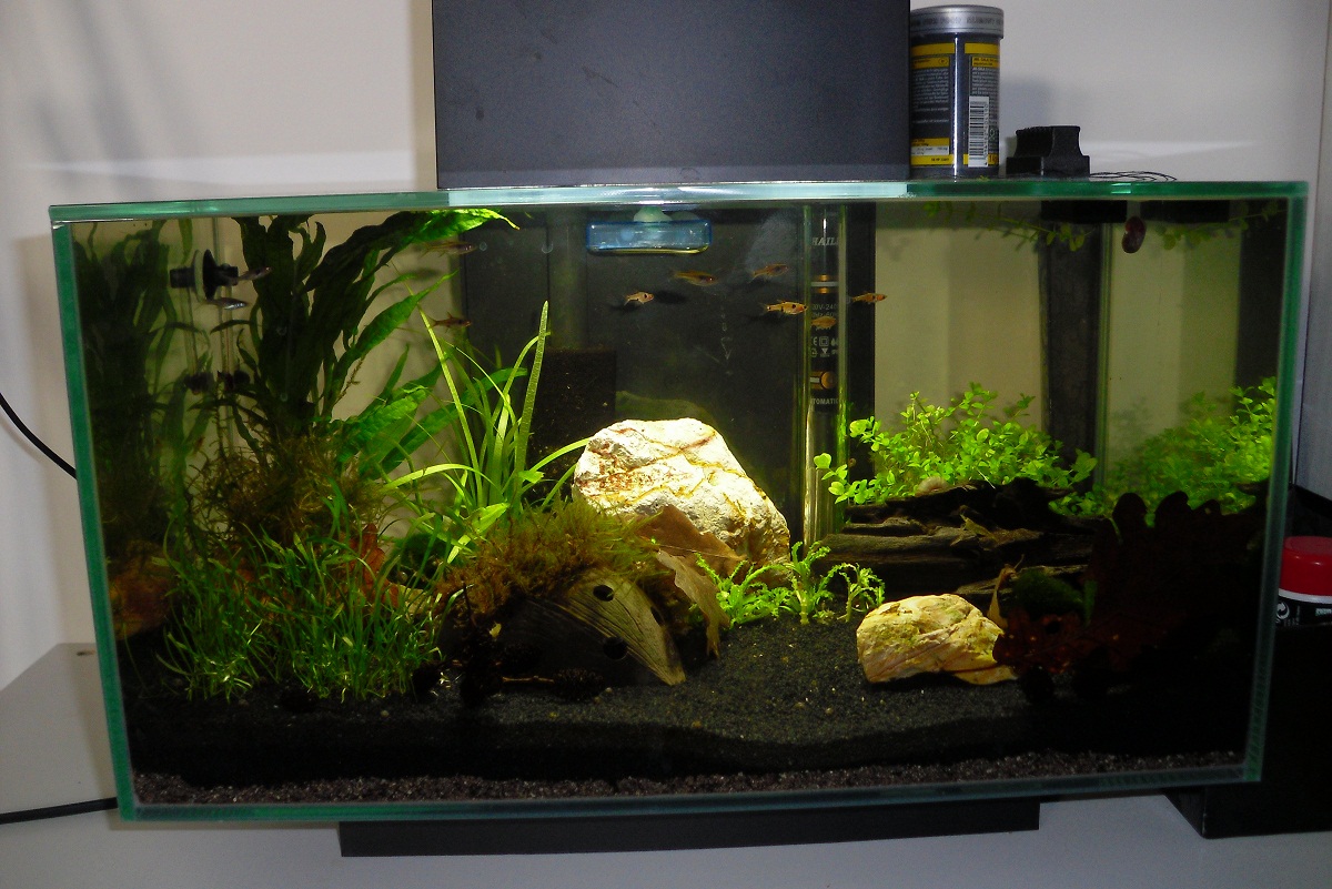 Das Becken läuft seit Anfang Januar, da ich Filtermaterial und jede Menge Mulm aus dem 120l-Becken meiner Schwägerin übernehmen konnte, durften bereits nach einer Woche Schnecken und Yellow Fires einziehen. Eine Woche später kamen dann die Zwergbärblinge hinzu. Allen Bewohnern gehts prächtig, Fische und Nelen harmonieren super untereinander.