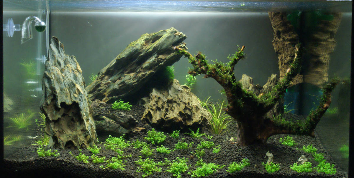 Nun stand es endlich da und in meinem Kopf war es bereits komplett eingerichtet und mit Pflanzen bestückt. Die Pflanzen hatte ich zum Glück aus den drei Cubes nehmen können. Eigentlich sah der Plan auch nur wenige Arten vor. Alles sollte von HCC bestimmt werden, das in der gesamten vorderen Hälfte alles überziehen sollte und auch noch soll. Zwischen den Steinen in der hinteren Hälfte sowie im Hintergrund plante ich mit Blyxa japonica sowie einzelnen Exemplaren von Staurogyne repens und Pogostemon erectus. Ein irrläufiger Ableger Pogostemon helferi gesellte sich später auch noch hinzu.